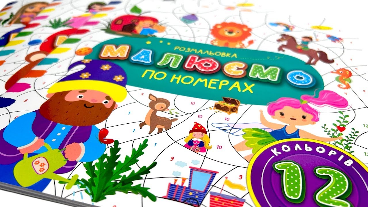 На 12 сторінках книги заховані веселі картинки, але щоб їх побачити, необхідно розфарбувати кожну ділянку кольором, що відповідає цифрі в цій зоні. Рухайтесь крок за кроком і перед вами постане гарний та яскравий малюнок.