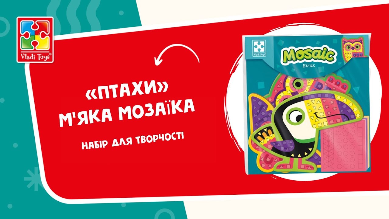 Чудові різнокольорові пташки вже хочуть розповісти вам свої неймовірні історії! Набір мозаїки Vladi Toys призначений для дітей від 3 років. Він розвиває фантазію, креативність, сприйняття, уяву і дрібну моторику.