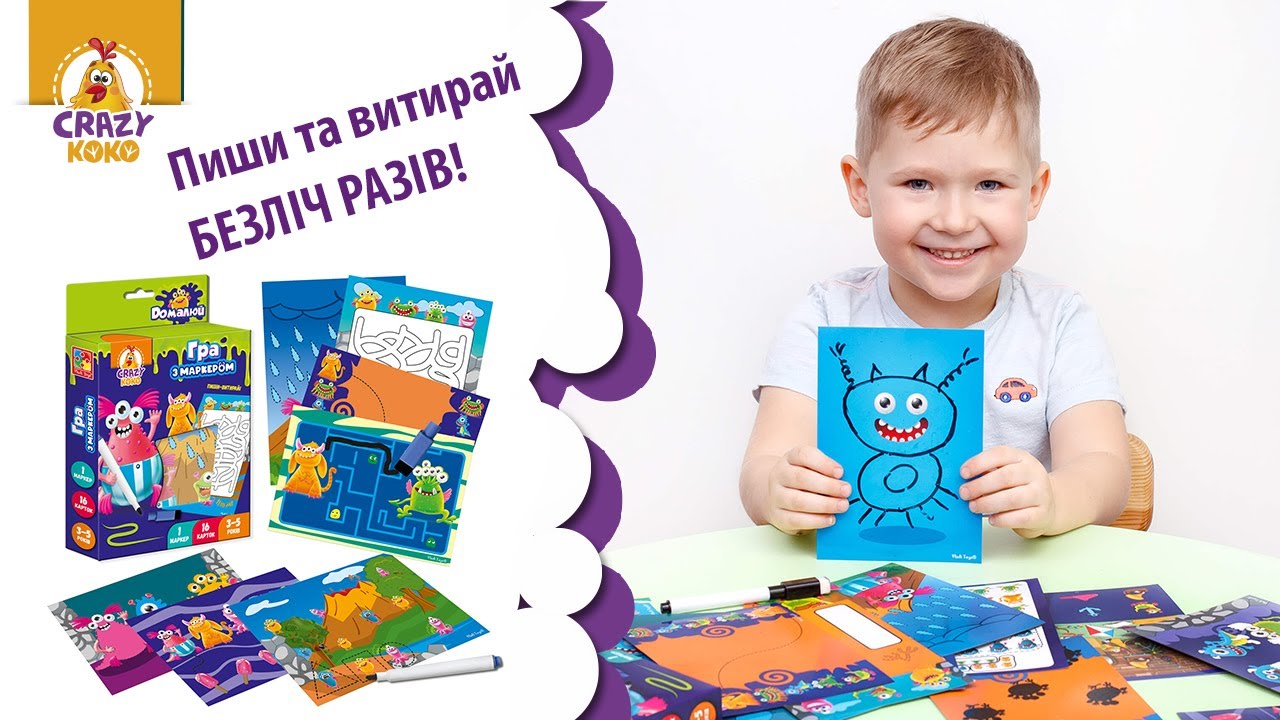 Розгляньте з дитиною карти й виберіть завдання, яке їй сподобається: ребуси, розмальовки, лабіринти та багато іншого. Не бійтеся помилятися: маркер легко стерти з ламінованої поверхні картки спеціальною губкою. Грати можна нескінченну кількість разів.